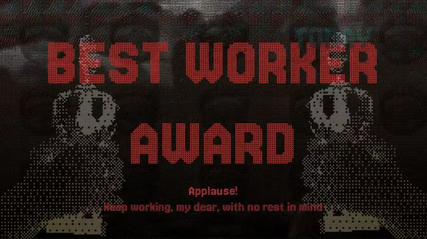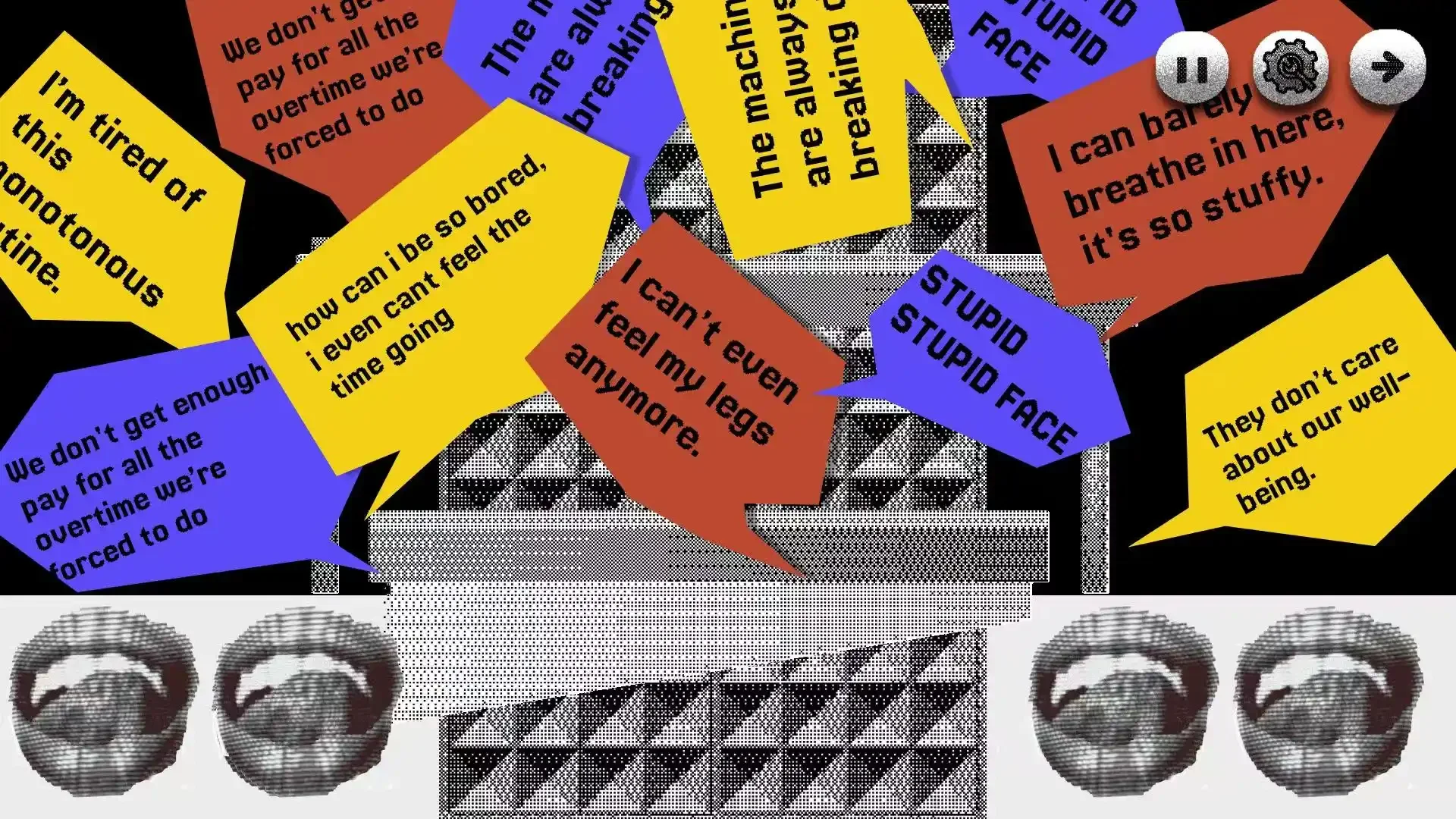 Laborer Bebop weaves a Sisyphean journey within the cocoon of a sealed factory, where rhythmic cuts through bubble sheets and the endless popping of thought-bubbles echo the laborer’s unending cycle of toil and introspection.