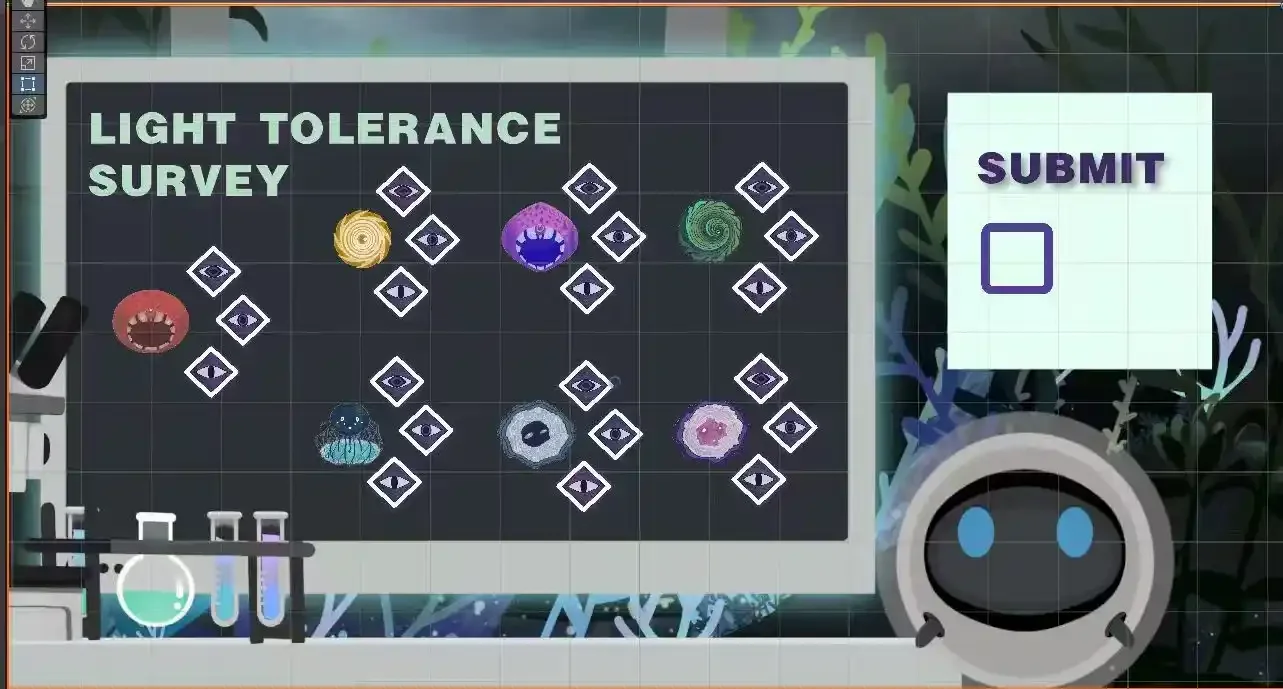 Your goal is to record and memorize the maximum light tolerance of the tiny creatures you meet, while staying alive from the predators. After the timer goes to zero, you’ll need to fill up an encyclopedia with your knowledge, by clicking on the three choices for each creature then press submit. You’ll only win if you get all of them right.